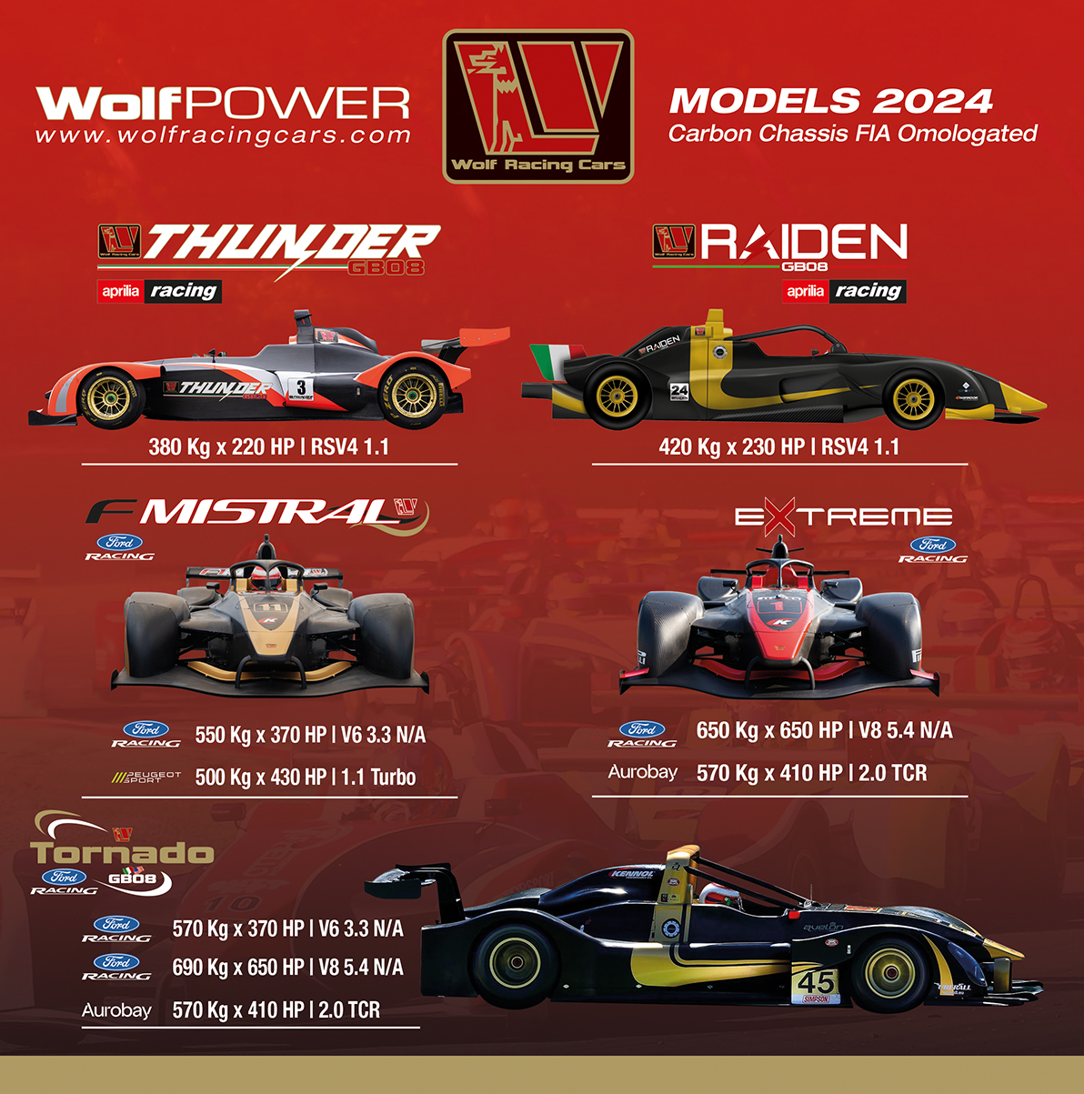 The cornerstone of Wolf Racing Cars' offering is the confirmed Wolf GB08 Thunder Powered by Aprilia 1.1, a car with incredible performance and ease of driving, thanks to its unbeatable power-to-weight ratio of 380 kg to 220 hp, available in a Track version and also in a specific Hill Climb version that will animate the CIVM Junior, the new championship established by Aci Sport.